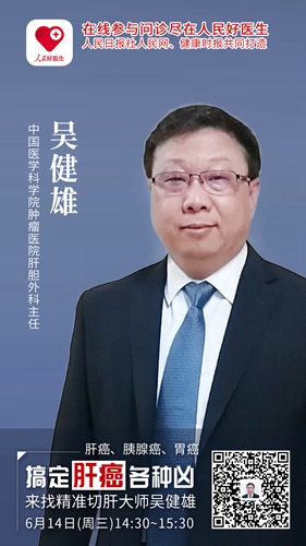 號難掛,大牌難見。沒關系,人民好醫生為您貼心都解決。6月14日下午14:30~15:30,吳健雄做客“人民好醫生”客戶端,直播解答肝癌防治相關問題,包括:肝炎、肝硬化、肝癌、胰腺癌等等,準備好提問,來找他吧!