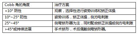 影像學診斷:X線有助于確立診斷及預后,其中最常用的方法是測量Cobb角。Cobb角測量方法是從最傾斜的近端椎及遠端椎終板延長線分別做垂線形成的交角,根據椎體椎弓根的位置可粗略判斷脊柱的旋轉程度。