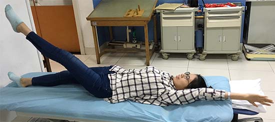 第三節:左腿屈曲,足踩床面,抬起腰、臀及右腿。