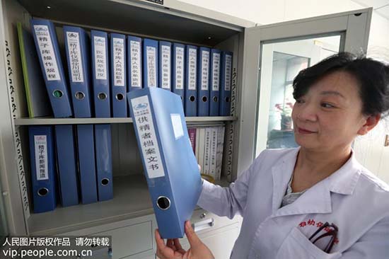 2017年4月5日,新疆維吾爾自治區婦幼保健院新疆人類精子庫,檔案管理人員正在檢查捐精者檔案。(張秀科/人民圖片)