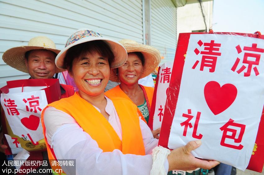 2016年7月28日,安徽省阜陽市潁州區三合鎮的鄉村環衛工高興地領到了“清涼禮包”。(王彪/人民圖片)
