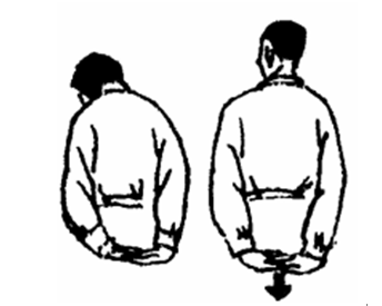 ④ 低頭含胸,兩手交叉放于背后,肘半屈,手心向上,隨后挺胸用力伸肘,同時反掌向下,后頸部向上伸,感覺后頸部肌肉用力收緊即可,重復10次。