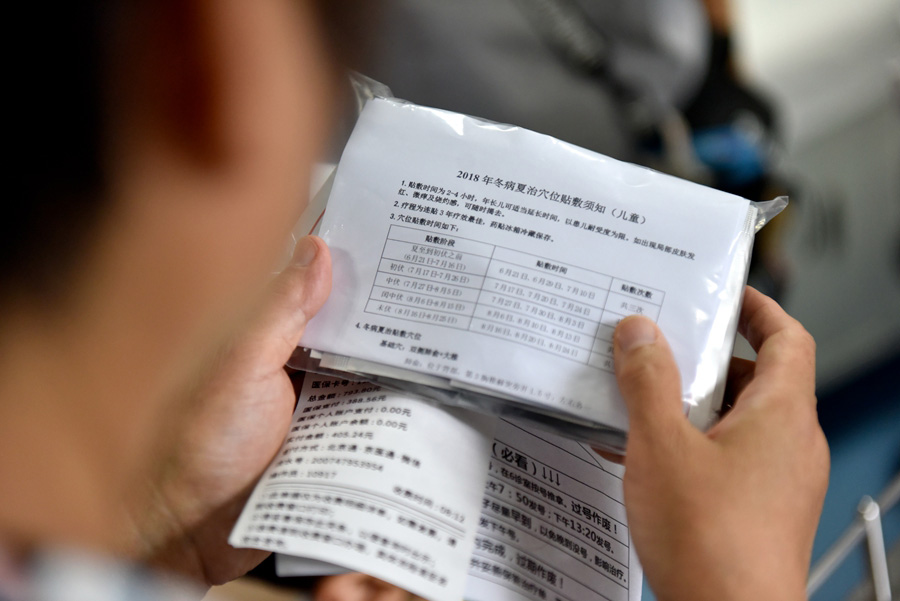 夏日炎炎,市民們對三伏貼的熱情不減。作為中醫(yī)特色療法之一,“冬病夏治”三伏貼一直深受廣大群眾喜愛。今年的三伏天從7月17日開始,至8月25日結(jié)束,為期40天。從昨日起,一年一度的三伏貼在北京市各大社區(qū)衛(wèi)生服務(wù)機構(gòu)和部分醫(yī)院正式開貼。圖為在北京中醫(yī)醫(yī)院兒科,家長正在閱讀2018年冬病夏治穴位貼敷須知(攝影/呂宏科)
