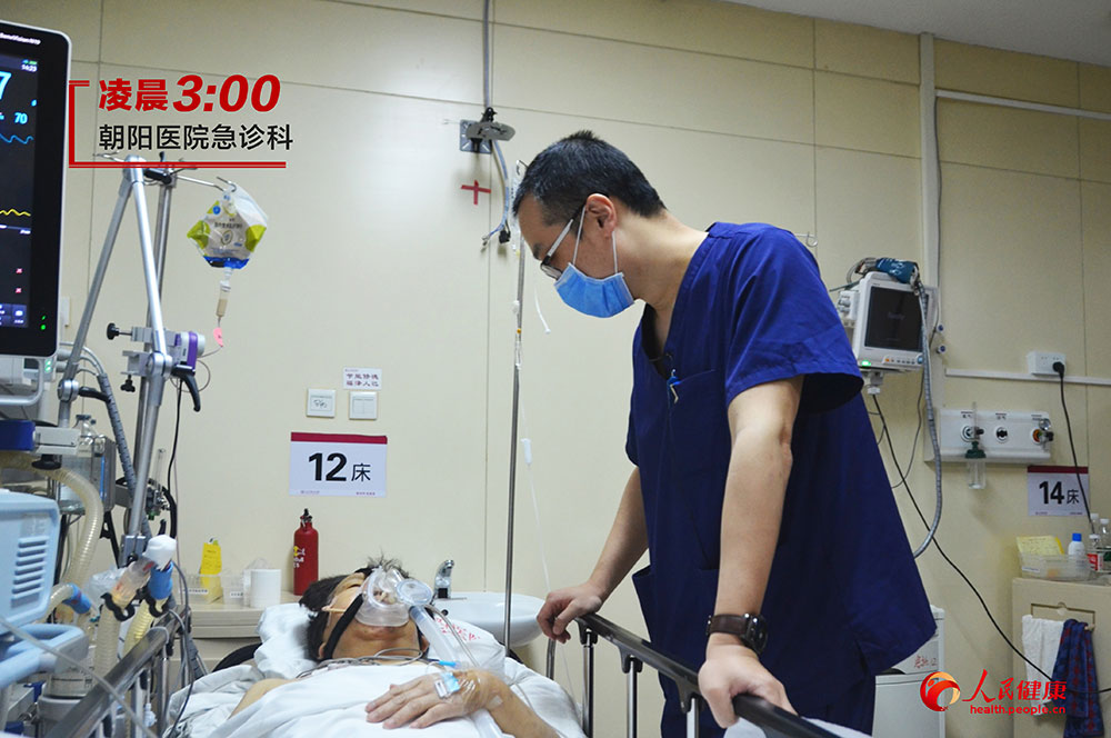 凌晨3點的朝陽醫院急診科,醫生袁偉正在查看病人情況/王國菁攝