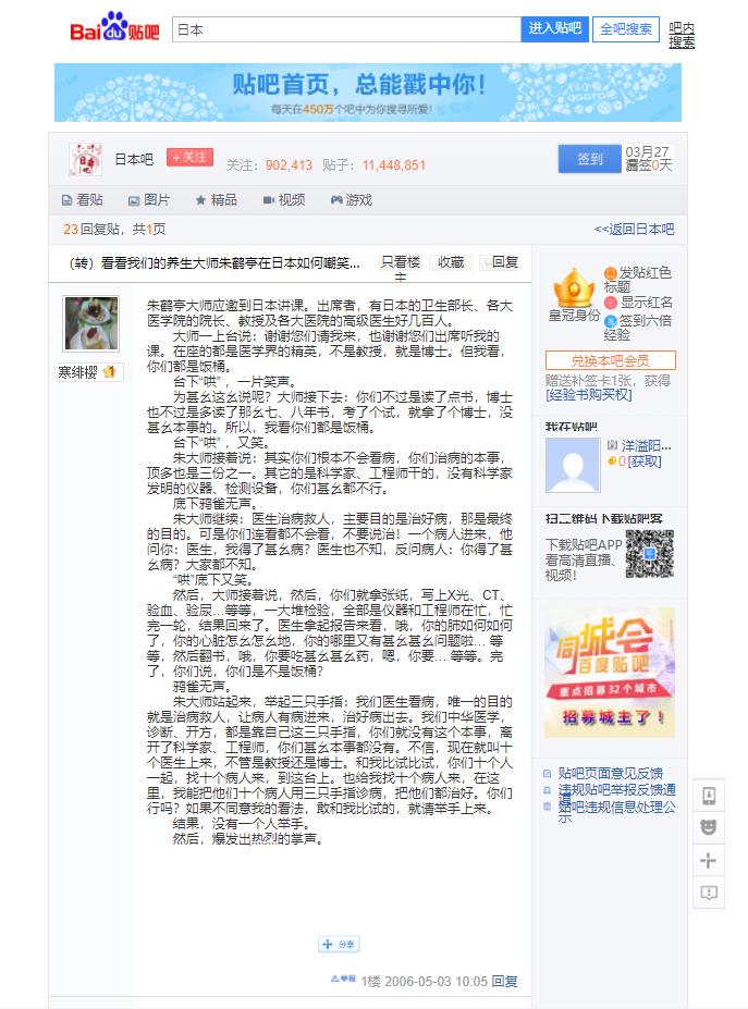 記者同時注意到,這篇文章其實并不是“新聞”。早在2006年5月,百度貼吧日本吧就曾發表過一篇題為《(轉)看看我們的養生大師朱鶴亭在日本如何嘲笑他們飯桶~》的貼文,文章內容與上述自媒體所傳播的幾乎沒有多大區別,只不過朱鶴亭的頭銜從“養生大師”變成了“中醫大師”、“醫學大師”……