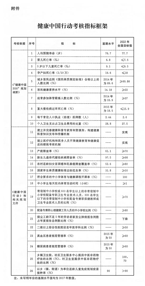 (二)考核內容。圍繞健康中國建設主要目標任務要求,同時兼顧數據的可獲得性,建立相對穩定的考核指標框架(見附件)。各省(區、市)在對下一級進行考核時,可根據本地實際情況對考核指標進行調整完善。