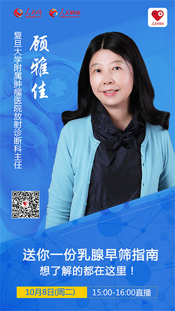 2019年10月8日(周二)15:00-16:00,復旦大學附屬腫瘤醫院放射診斷科主任顧雅佳將在“人民好醫生”客戶端進行視頻、圖文直播,并在線解答關于乳腺癌防治篩查的問題,千萬不要錯過!