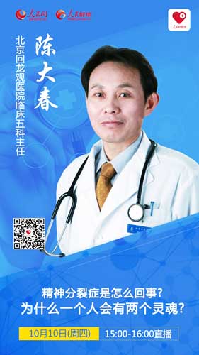 2019年10月10日(周四)下午15:00,“人民好醫生”客戶端將邀請北京回龍觀醫院臨床五科主任,北京大學醫學部教授陳大春進行視頻和圖文訪談,為您解答怎樣才算精神分裂癥?有沒有先兆?確診后該如何進行治療?敬請關注!
