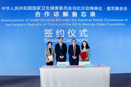 國家衛生健康委員會主任馬曉偉(左二)、國際合作司司長張揚(左一)與比爾及梅琳達·蓋茨基金會聯席主席比爾·蓋茨(右二)、北京代表處首席代表李一諾(右一)共同出席合作諒解備忘錄簽約儀式