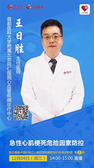 2019年12月04日(周三)下午14:00-15:00,“人民好醫(yī)生”客戶端將邀請首都醫(yī)科大學(xué)附屬北京同仁醫(yī)院心血管疾病診療中心主任醫(yī)師王日勝進行視頻和圖文直播,帶您了解和識別心肌梗死的先兆癥狀并給予及時處理,以及教您如何在生活中預(yù)防急性心肌梗死。并在線解答廣大網(wǎng)友相關(guān)問題,千萬不要錯過!