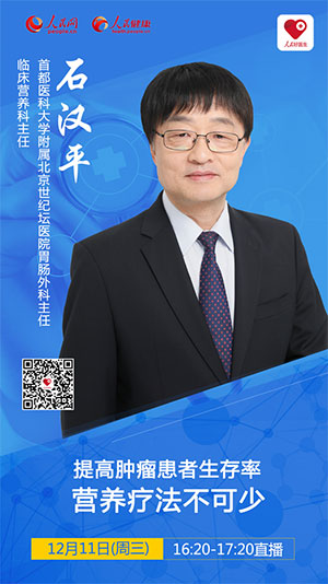 2019年12月11日(周三)下午16:20,"人民好醫生"客戶端將邀請首都醫科大學附屬北京世紀壇醫院胃腸外科主任、臨床營養科主任石漢平進行視頻和圖文訪談,為您解答腫瘤病人對營養的認識誤區。