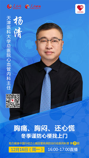 2019年12月16日(周一)下午16:00-17:00,“人民好醫(yī)生”客戶端將邀請天津醫(yī)科大學總醫(yī)院心血管內(nèi)科主任楊清教授進行視頻和文字直播,給大家講解冬季心梗的預(yù)防和急救方法,還可以在線向楊教授提問,幫大家解疑答惑,記得提前下載“人民好醫(yī)生”APP,觀看健康直播。