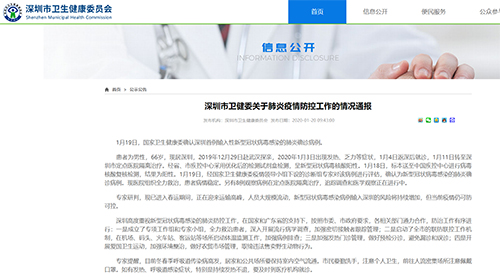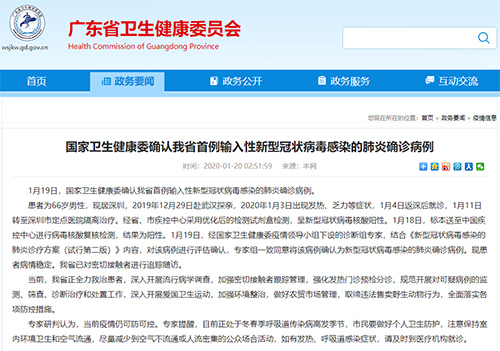 據廣東省衛生健康委員會20日凌晨于官網發布的《國家衛生健康委確認我省首例輸入性新型冠狀病毒感染的肺炎確診病例》顯示,1月19日,國家衛生健康委確認廣東省首例輸入性新型冠狀病毒感染的肺炎確診病例。
