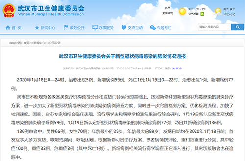 此外,武漢市衛生健康委員會20日凌晨于官網發布《武漢市衛生健康委員會關于新型冠狀病毒感染的肺炎情況通報》(以下簡稱“通報”)稱,2020年1月18日0—24時,治愈出院5例,新增病例59例,死亡1例;1月19日0—22時,治愈出院1例,新增病例77例。