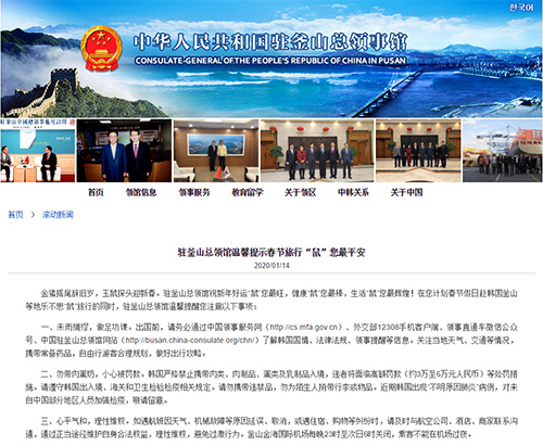中國駐釜山總領館于14日溫馨提醒計劃在春節假日赴韓國釜山的游客,近期韓國出現“不明原因肺炎”病例,對來自中國部分地區人員加強檢疫,敬請留意。
