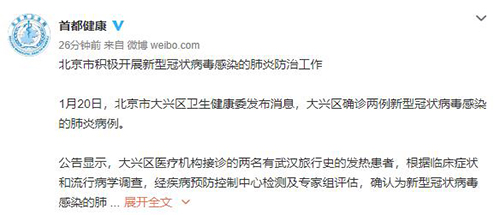 另據北京市大興區衛生健康委員會20日凌晨于官方微博發布消息,大興區確診兩例新型冠狀病毒感染的肺炎病例。