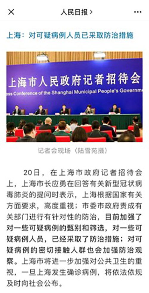 上海市對新型冠狀病毒感染肺炎可疑病例人員已采取防治措施