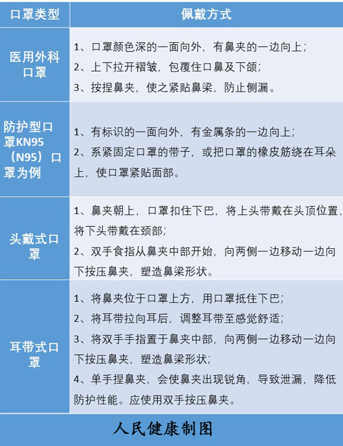 國家衛健委指出,不同的人群選擇口罩時應根據自身情況選擇合適的口罩類型,不過度防護。另外,戴口罩時要進行氣密性檢查,雙手捂住口罩呼吸,若感覺有氣體從鼻夾處泄漏,應重新調整鼻夾,若感覺氣體從口罩兩側漏出,需進一步調整頭帶、耳帶位置;如果不能密合,則需更換口罩型號。