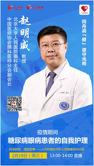 2020年2月19日 (周三)下午13:00,“人民好醫(yī)生”客戶端將邀請(qǐng)北京大學(xué)人民醫(yī)院眼科與眼視光中心主任趙明威教授進(jìn)行視頻直播,結(jié)合糖尿病患者眼病的特點(diǎn),科普眼科疾病評(píng)估、治療及術(shù)后日常護(hù)理。