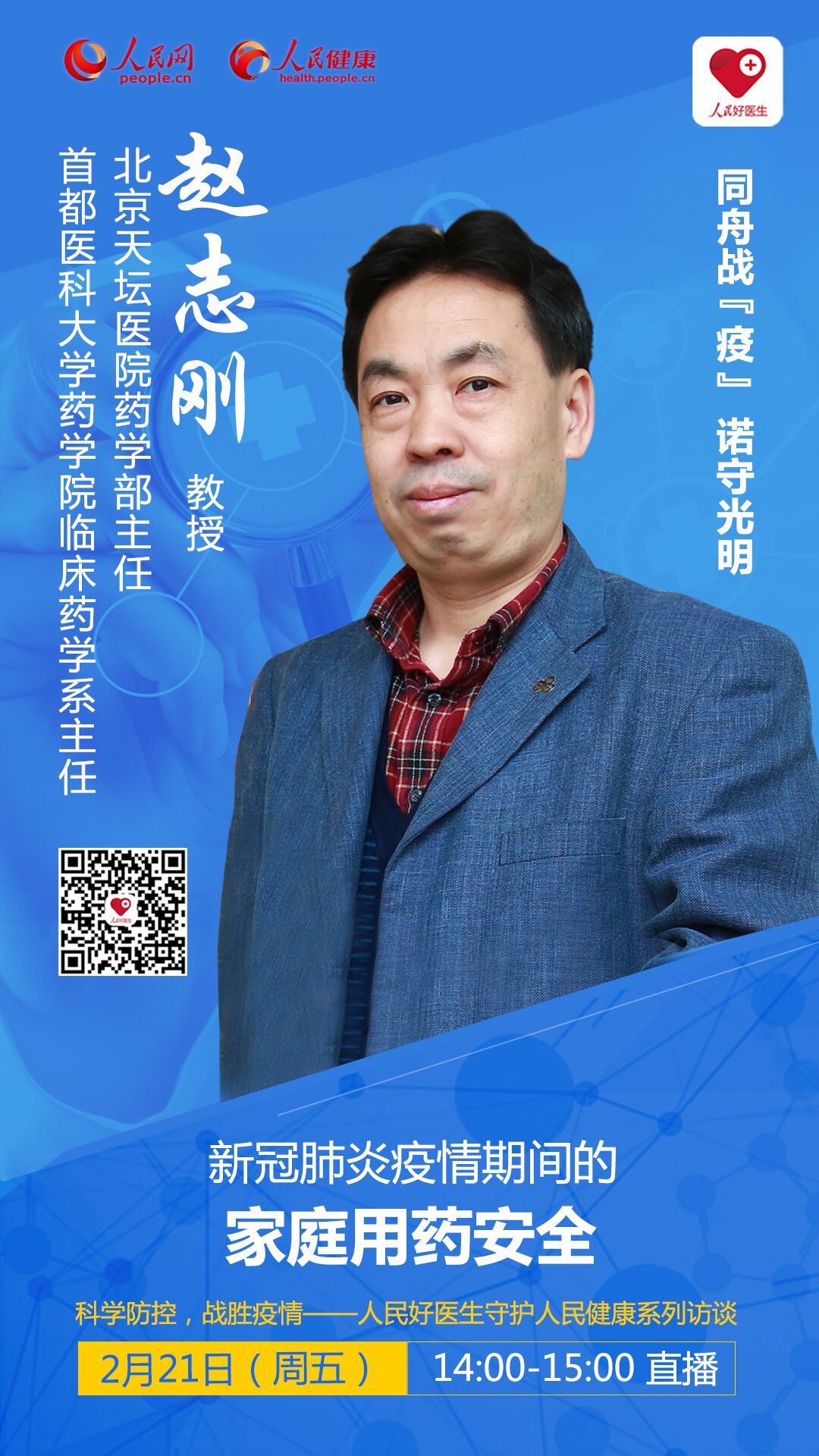 2020年2月21日(周五)下午14:00-15:00,“人民好醫生”客戶端將邀請北京天壇醫院藥學部主任、首都醫科大學藥學院臨床藥學系主任趙志剛進行視頻直播,與您探討疫情期間的家庭用藥安全問題。