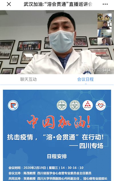 中國醫師協會胸痛專業委會主任委員霍勇、中國醫師協會胸痛專業委會副主任委員傅向華、四川省醫學會心血管專業委員會主任委員陳茂、四川大學華西醫院胸痛中心醫學總監張立、四川大學華西醫院心內科副主任賀勇等心血管領域專家,通過直播為大家講解疫情期間如何做好心血管病患者的救治及醫護人員的防護等問題。據統計,此次線上會議有超過2.7萬人次在平臺觀看,9970多條彈幕留言。