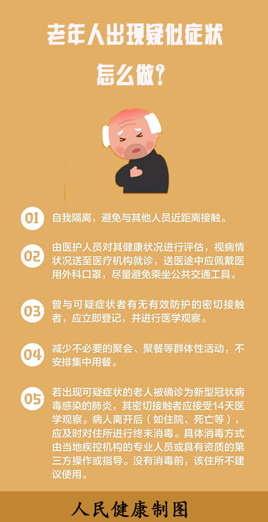 老年人若出現新冠肺炎可疑癥狀,如發熱、咳嗽、咽痛、胸悶、呼吸困難、輕度納差、乏力等癥狀時,應立即對該老年人單間隔離,避免與他人近距離接觸,立即向當地社區衛生機構或疾控機構報告,協助開展相關調查處置工作。曾與可疑癥狀者有過無有效防護的密切接觸者,應立即登記進行醫學觀察。同時,向民政部門報告和通知家屬。陪同送醫途中,老年人及其陪護人員應始終佩戴口罩,并盡量避免乘坐公共交通工具。