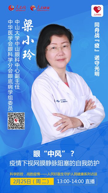 2020年2月25日(周二)13:00-14:00,“人民好醫生”客戶端將邀請中華醫學會眼科學分會眼底病學組委員、中山大學中山眼科中心副主任梁小玲進行視頻直播,與您探討疫情下視網膜靜脈阻塞的自我防護。