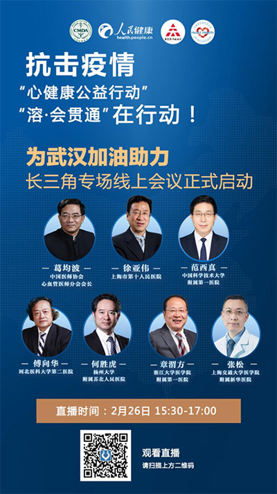 中國醫師協會心血管醫師分會會長葛均波院士、中國醫師協會胸痛專業委會主任委員霍勇教授、中國科學技術大學附屬第一醫院范西真教授、上海市第十人民醫院徐亞偉教授、河北醫科大學第二醫院傅向華教授、揚州大學附屬蘇北人民醫院何勝虎教授、中南大學湘雅醫院余再新教授、湖南省人民醫院潘宏偉教授、浙江大學醫學院附屬第一醫院章渭方教授、上海交通大學醫學院附屬新華醫院張松教授、常德市第一人民醫院葛良清教授、岳陽市第一人民醫院趙建華教授、永州市中心醫院龍雙祁教授、邵陽市中心醫院劉鵬教授、長沙市第四醫院王永紅教授、中南大學湘雅醫院彭禮明教授等各位專家將針對新型冠狀病毒疫情下的STEMI 患者救治原則、溶栓治療的常見問題做講解,以期盡快開通梗死相關血管,提高基層醫療救治能力,同時保護心血管醫師避免感染。廣大心血管防治領域的工作者可以通過網絡平臺收看本場活動內容。