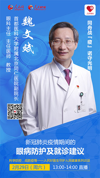 2020年2月29日(周六)13:00-14:00,“人民好醫生”客戶端將邀請北京同仁醫院副院長、中華醫學會眼科學分會常務委員魏文斌教授進行視頻直播,疫情來襲,讓我們共同聚焦眼部護理,共塑光明視界。