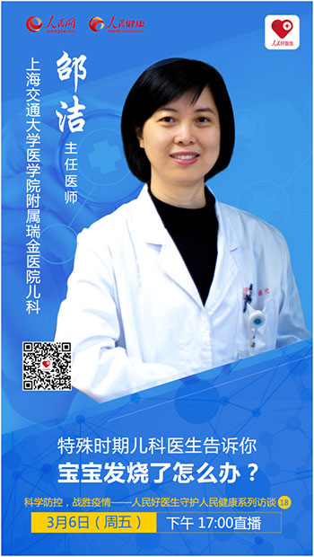 2020年3月6日(周五)17:00,“人民好醫生”客戶端將邀請上海交通大學醫學院附屬瑞金醫院兒科主任醫師邵潔進行視頻直播,結合新冠肺炎的特點,科普疾病的評估分型、治療及愈后日常護理,千萬不要錯過。