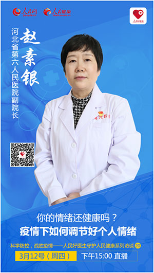 2020年3月12號(hào)(周四)15:00,“人民好醫(yī)生”客戶端將邀請(qǐng)河北省第六人民醫(yī)院副院長趙素銀教授進(jìn)行視頻直播,與您探討疫情期間,如何調(diào)節(jié)好個(gè)人情緒。