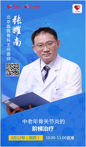 隨著我國人口不斷老齡化,中老年骨關節炎的發病率和患病率都呈逐年遞增的趨勢,老年人因身體機能老化,越是高齡患病風險越高,這給患者的生活質量和身體健康造成了較大的影響。2020年3月12日(周四)10:00-11:00,“人民好醫生”客戶端將邀請北京醫院骨科主任醫師張耀南進行視頻直播,以膝骨關節為例為您講解治療方案以及如何預防中老年骨關節損傷。