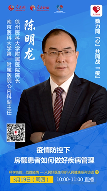 2020年3月19日(周四) 10:00-11:00,“人民好醫(yī)生”客戶端將邀請徐州醫(yī)科大學(xué)附屬醫(yī)院院長、南京醫(yī)科大學(xué)第一附屬醫(yī)院心內(nèi)科副主任陳明龍進行視頻直播,與您分享疫情防控期間,房顫患者該如何做好疾病管理。