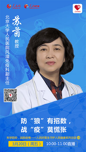 2020年03月20日(周五)10:00-11:00,“人民好醫(yī)生”客戶端將邀請(qǐng)北京大學(xué)人民醫(yī)院風(fēng)濕免疫科副主任蘇茵教授進(jìn)行視頻直播,結(jié)合系統(tǒng)性紅斑狼瘡診療的特點(diǎn),科普疾病的治療及日常管理,千萬(wàn)不要錯(cuò)過。