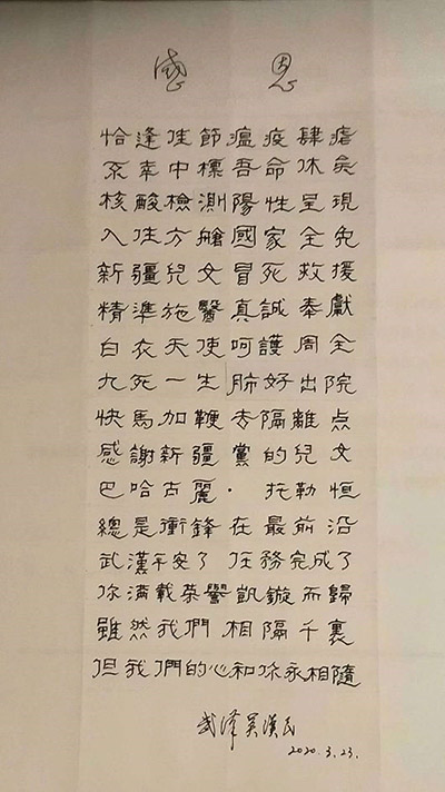 “在方艙醫院,我第一次見到上千人一起居住的病區,這和我以前看到過的病區截然不同。”巴哈古麗說:“剛到武漢時,物資準備都需要我們自己完成,我作為領隊的協助者、聯絡員,每天要協調很多事情,既是物資搬運工,也是病區清潔工、消毒人員。不過我們得到了武漢當地愛心人士和酒店工作人員的支持,幫助我們很快克服了這些困難。”
