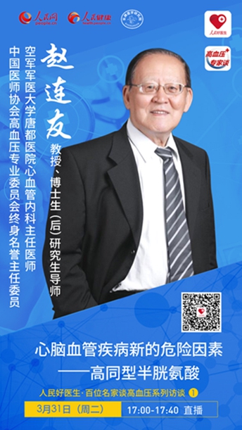 2020年3月31日(周二) 17:00-17:40,“人民好醫(yī)生”客戶端將邀請中國醫(yī)師協(xié)會高血壓專業(yè)委員會終身名譽(yù)主任委員、空軍軍醫(yī)大學(xué)唐都醫(yī)院心血管內(nèi)科主任醫(yī)師、教授、博士生(后)研究生導(dǎo)師趙連友進(jìn)行視頻直播,為您介紹心腦血管疾病新的危險(xiǎn)因素——高同型半胱氨酸。