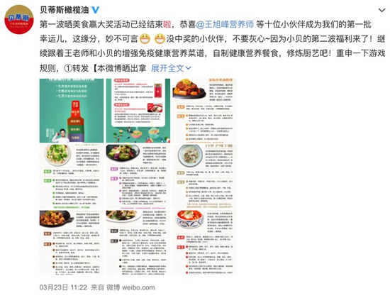 從官方微博發布七色美食海報到微博大V“下場”支持,貝蒂斯橄欖油健康自制美食征集活動在網絡迅速擴散。網友們通過曬自制美食圖、分享拿手菜參與活動。活動當天,#是時候家里備瓶好油啦#的微博話題迅速沖上了微博美食榜的前6名。