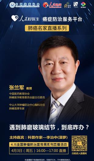 2020年4月3日(周五) 16:00-17:00,“人民好醫(yī)生”聯(lián)合中國抗癌協(xié)會推出肺癌名家直播系列第一期,邀請中國醫(yī)藥教育協(xié)會肺癌醫(yī)學教育委員會副主任委員、中山大學腫瘤防治中心胸科主任張?zhí)m軍教授進行視頻直播,一同探討遇到肺磨玻璃結(jié)節(jié)該如何治療。