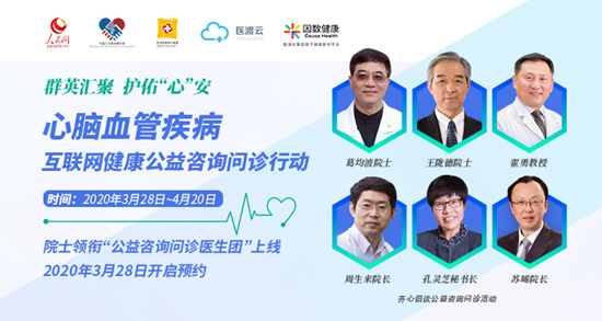 在抗擊疫情仍不可松懈的特殊時期,為降低頻繁往返醫院可能存在交叉感染的風險,幫助解決心腦血管疾病輕癥、非危急重癥等患者的復診、用藥、居家護理等需求,由人民網指導,人民健康、中國心血管健康聯盟、中國縣域醫院院長聯盟聯合主辦,由葛均波院士、王隴德院士、霍勇教授、周生來教授、孔靈芝教授、蘇晞教授等著名心腦血管疾病專家聯袂領銜并發起倡議,醫渡云集團旗下因數健康在線醫療健康服務平臺特別推出“心腦血管疾病互聯網健康公益咨詢問診行動”。