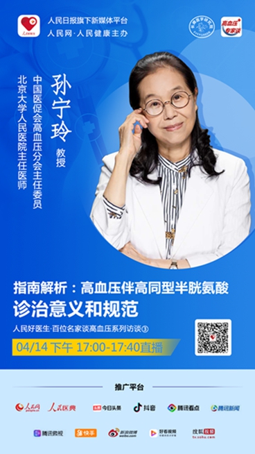 2020年4月14日(周二)17:00-17:40“人民好醫(yī)生”客戶端將邀請中國醫(yī)促會高血壓分會主任委員、北京大學人民醫(yī)院主任醫(yī)師 孫寧玲教授進行視頻直播,為您解析高血壓伴高同型半胱氨酸臨床診治意義和規(guī)范。