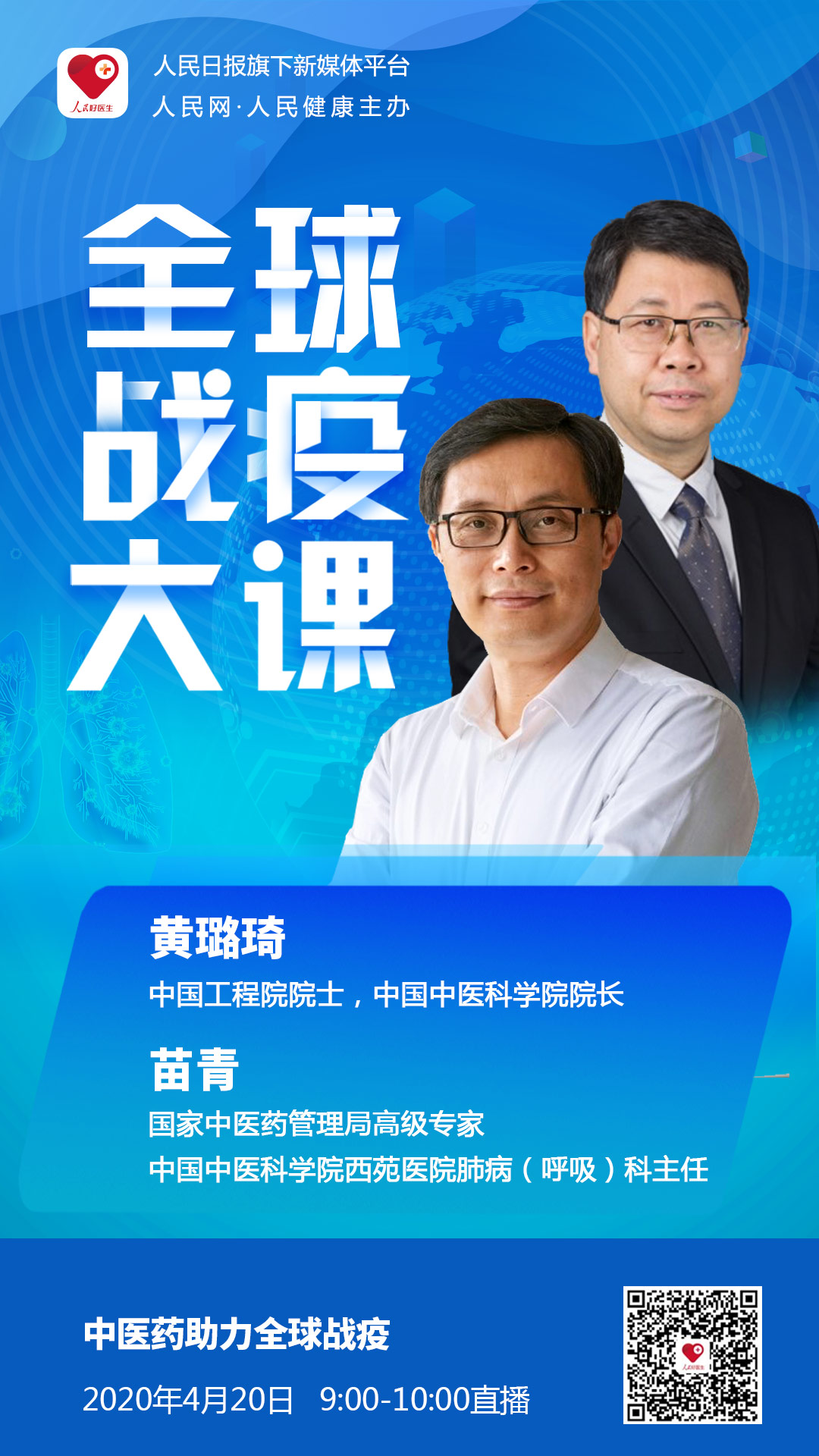 2020年04月20日(周一)9:00-10:00,“人民好醫生”客戶端將邀請中國工程院院士,中國中醫科學院院長黃璐琦院士和中國中醫科學院西苑醫院肺病(呼吸)科主任苗青教授進行視頻直播,介紹中醫藥在此次疫情中發揮的作用,科普疾病的治療及日常管理,千萬不要錯過。