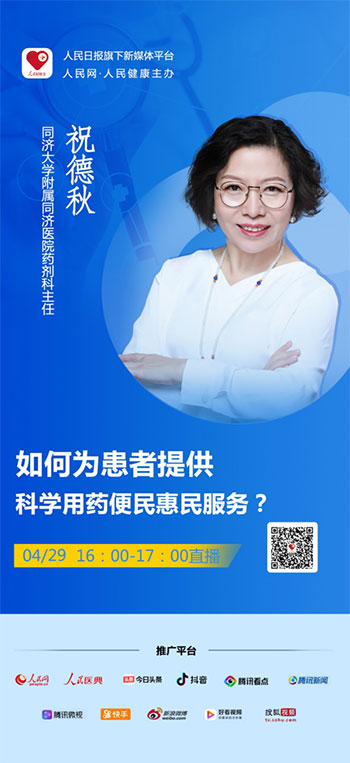 藥事服務不是簡單的藥師在發藥窗口依照處方發藥,而是藥師應用藥學專業知識向醫療人員、患者及其家屬提供與藥物使用有關的服務。2020年4月29日(周三)16:00-17:00,人民日報社旗下新媒體平臺“人民好醫生”客戶端邀請同濟大學附屬同濟醫院藥劑科主任祝德秋進行視頻直播訪談,指導患者如何科學用藥?