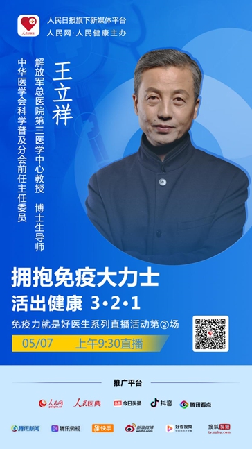 人民日報社旗下新媒體“人民好醫(yī)生”客戶端特別策劃“免疫力就是好醫(yī)生系列直播活動”。2020年5月7日上午9:30,解放軍總醫(yī)院第三醫(yī)學(xué)中心博士生導(dǎo)師,中華醫(yī)學(xué)會科學(xué)普及分會前任主任委員王立祥教授將進(jìn)行系列活動的第二場視頻訪談,歡迎屆時收看。