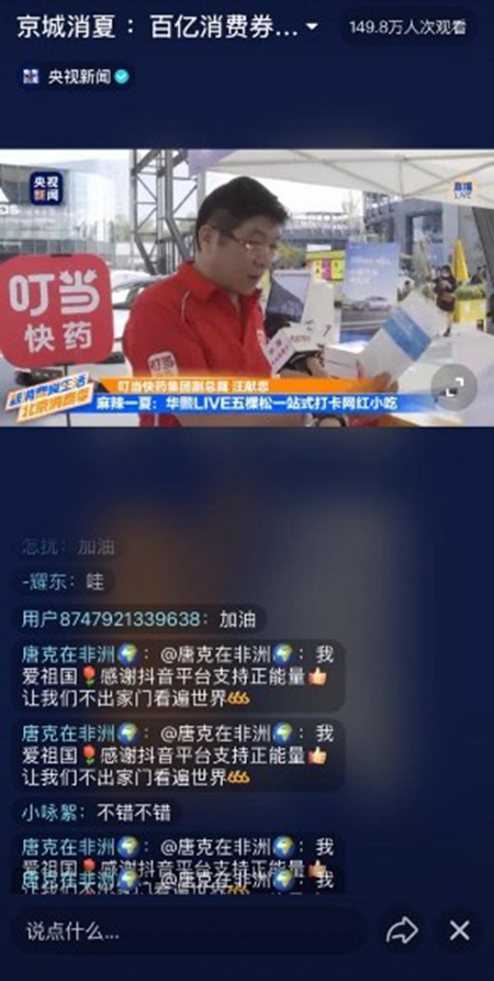 叮當快藥副總裁汪獻忠受邀參加央視新聞直播采訪,向央視新聞客戶端、微博、抖音、快手五大平臺用戶介紹叮當快藥發(fā)放健康消費券、醫(yī)用口罩1元購以及慢病藥直降價三大惠民措施,累計超過528萬粉絲在線圍觀、互動。