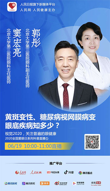 2020年6月19日10:00-11:00,人民日?qǐng)?bào)社旗下新媒體“人民好醫(yī)生”客戶端將邀請(qǐng)北京大學(xué)第三醫(yī)院眼科主任醫(yī)師竇宏亮、北京大學(xué)第三醫(yī)院眼科副主任醫(yī)師郭彤進(jìn)行視頻直播,為大家系統(tǒng)講解眼底疾病如何預(yù)防及治療,千萬不要錯(cuò)過。