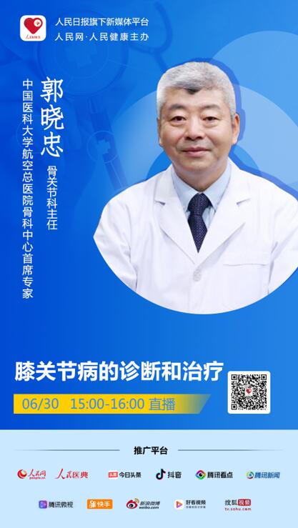 2020年6月30日 周二 15:00-16:00,人民日報社旗下新媒體“人民好醫生”客戶端將邀請中國醫科大學航空總醫院骨科中心首席專家、骨關節科主任郭曉忠進行視頻直播,為大家解答膝關節病的診斷和治療相關問題,千萬不要錯過。