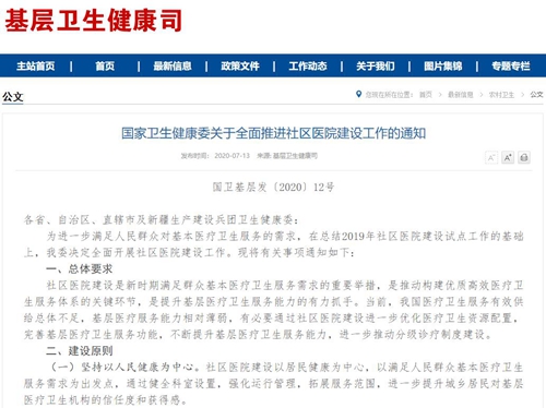 人民網北京7月13日電(董童)13日,據國家衛生健康委官網消息,為進一步滿足人民群眾對基本醫療衛生服務的需求,在全面總結2019年試點工作的基礎上,按照2020年全國衛生健康工作會議精神,國家衛生健康委經研究制定了《關于全面推進社區醫院建設工作的通知》(以下簡稱“通知”)。