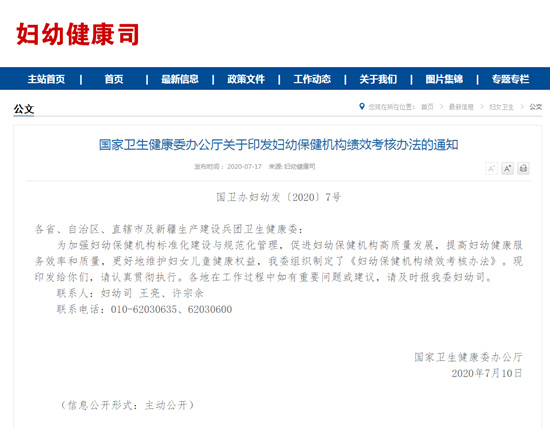 人民網北京7月18日電 據國家衛健委網站消息,國家衛健委辦公廳近日發布了《關于印發婦幼保健機構績效考核辦法的通知》(下簡稱《通知》),《通知》指出,為加強婦幼保健機構標準化建設與規范化管理,促進婦幼保健機構高質量發展,提高婦幼健康服務效率和質量,更好地維護婦女兒童健康權益,國家衛健委組織制定了《婦幼保健機構績效考核辦法》,并要求各省、自治區、直轄市及新疆生產建設兵團衛生健康委認真貫徹執行。