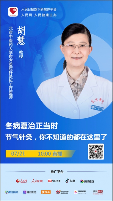7月21日10:00,人民好醫生邀請到北京中醫藥大學東方醫院針灸科主任醫師胡慧教授做客人民日報社旗下新媒體“人民好醫生”客戶端,與大家在線分享暑伏“節氣針灸”及“穴位貼敷”等多種療法的應用和選擇。