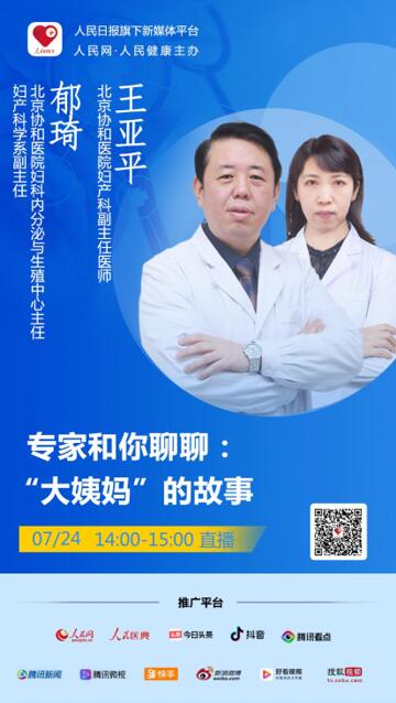 2020年7月24號14:00-15:00,人民日報社旗下新媒體“人民好醫(yī)生”客戶端將邀請北京協(xié)和醫(yī)院婦科內(nèi)分泌與生殖中心主任、婦產(chǎn)科學(xué)系副主任郁琦;北京協(xié)和醫(yī)院婦產(chǎn)科副主任醫(yī)師王亞平進行視頻訪談,在線分享“大姨媽”那些事兒。